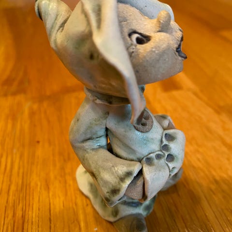 Herlig uttrykk, fakket musen i halen med den røde munnen og den turkise kroppen, der musen henger. Kan også stå ute.