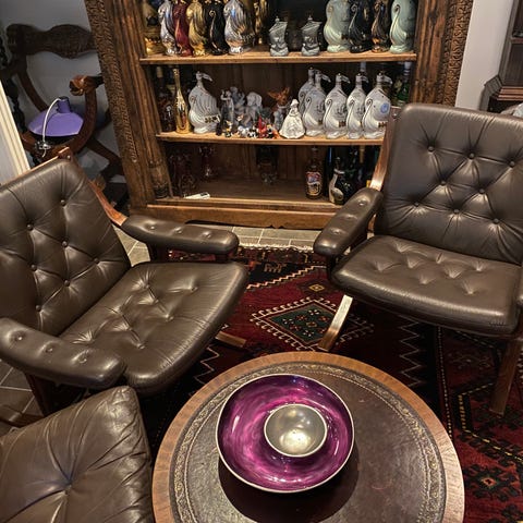Selges pris pr stk 1250kr. Selges samlet. Krakelerer noe i skinnet. Gode å sitte i. Må hentes.