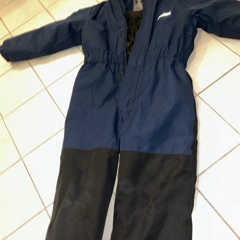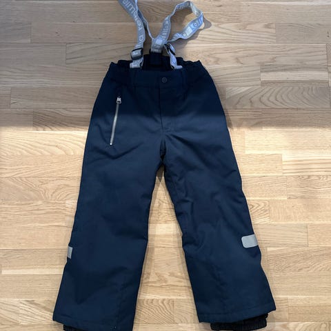 Reima vinterbukse med seler str 110. Lite brukt av ett barn. Refleksen på ene foten er litt løs, ca 1 cm av den er løsnet. Ellers ingen skader eller andre merknader.