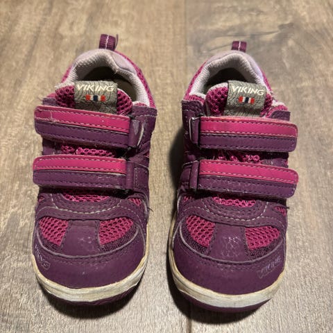 Selger Viking barnesko i størrelse 22. Skoene er designet for barn og har en kombinasjon av materialer i farger som inkluderer nyanser av rosa og lilla.