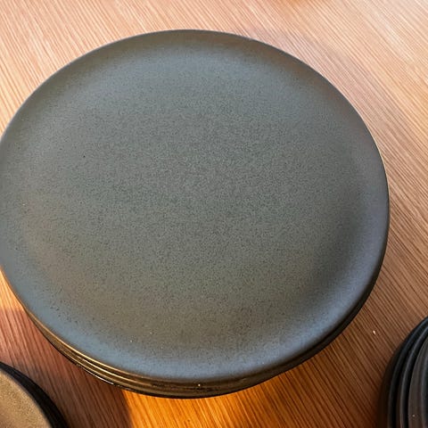 En stilig og robust servise i stentøy i en gråfarge med sjattering.