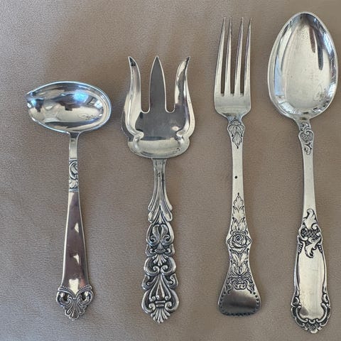 Gammelt bestikk med ulike skjeer og gaffel trenger litt omsorg og må pusses