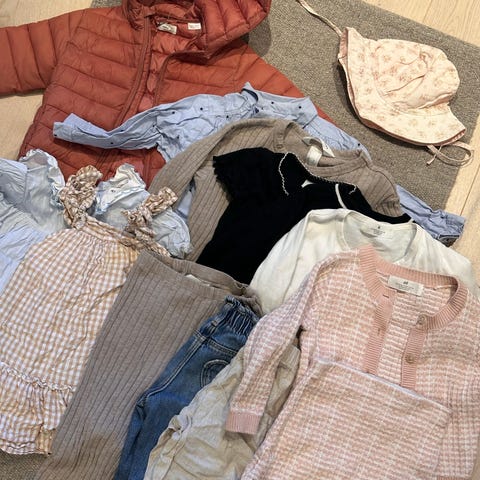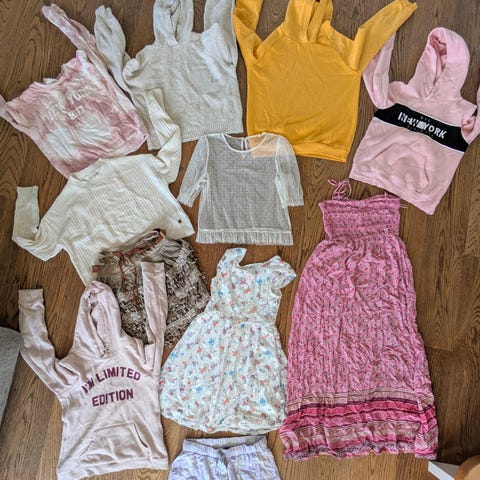 2 kjoler, en bluse med puffermer, en hettegenser en t-skjorte og en buksedress
