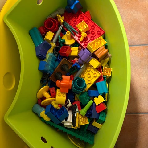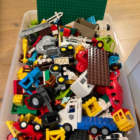 LEGO DUPLO med fargerike klosser, inkludert hus, blomster, tallblokker og kjøretøy fra sett #10572. Passer for små barn og gir muligheter for kreativ lek og læring.