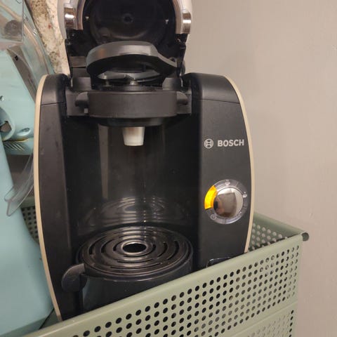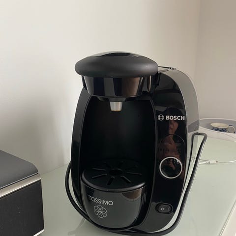 Bosch Tassimo kaffemaskin i svart farge. Maskinen har en kompakt størrelse og er designet for enkel bruk med Tassimo kapsler. Selger med en kapsel-kurv.