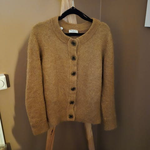 Brukt rød cardigan L , ubrukt marine genser m/knapper bak og en kort rustrød genser med 3/4 lang arm. To lommer foran og knapper bak.