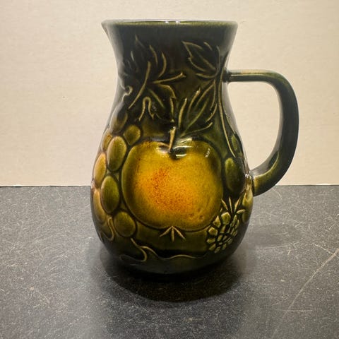 Dette er en robust og sjarmerende mugge i pressglass, kjent for sitt karakteristiske pregede mønster i bunnen og rundt sidene, ofte kalt "dobbelt tommelavtrykk" eller "kløver"-design.
