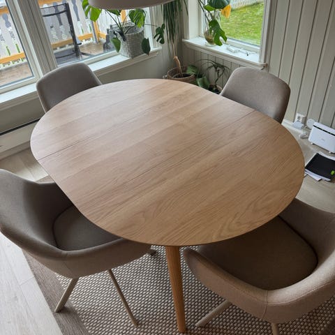 Flott og solid spisebord fra Sandvik møbler selges. Det medfølger 4 stoler. Bordet er 1 m bredt og 1,47 m langt. Det medfølger ileggsplate på 40 cm.