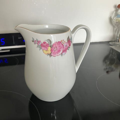Tysk Porselensmugge. Høyde 15 cm. Rommer ca 8dl . Pris 50kr. Må hentes I Skotselv. Sender ikke
