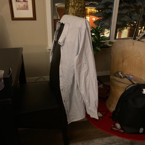 Hvit skjorte, står ikke str men tror den er rundt en L-XL, litt gjennomsiktig, lett å luftig, ingen bruksmerker, må bare strykes litt.