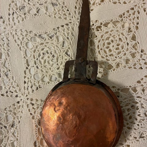 Ukjent merke kobber øse med langt håndtak. Egnet for servering eller som dekorativt kjøkkenredskap.