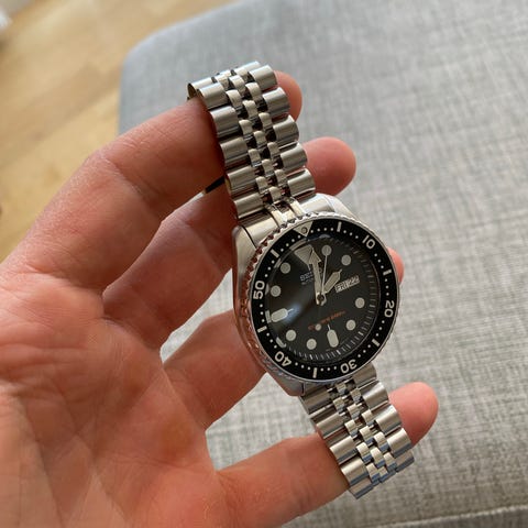 Seiko Diver's 200m herreklokke med automatisk urverk SKX007. Den har ligget i skuffen i flere år nå og på tide at noen andre kan bruke den. På den lille tiden den er brukt klarte jeg å få et par små skraper i glasset. Se bilde 2.