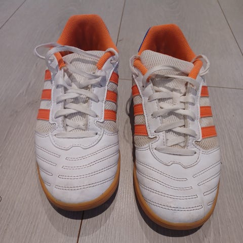 Adidas Sala inomhussko for herre i størrelse 37 1/3. Skoene er hvite med gullfargede detaljer og har gummisåle. Passer til innendørs bruk.