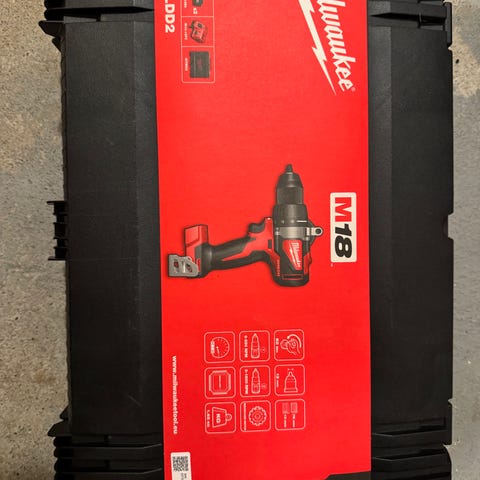 Kraftig Milwaukee M18 FDD3 børsteløs drill/skrumaskin. Dreiemoment på 158nm.