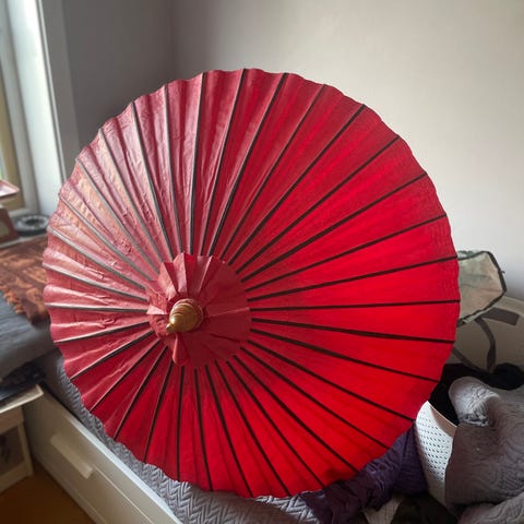 Flott eldre parasoll i tre/fin stand.Arvet så usikker på alder /fra hvor ol-bud