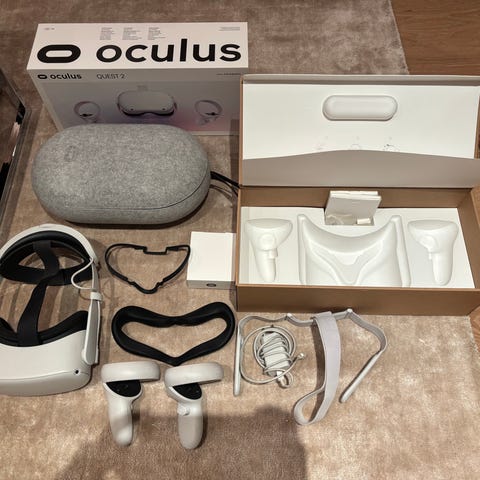 Headsettet har justerbar hodebøyle og innebygde linser for virtuell virkelighet. Kontrollere har flere knapper og styrespaker for interaksjon i VR-miljøer. Selges med hardcase til oppbevaring!
