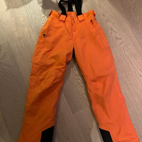 Didrikson Skibukse str160 i sort. Brukt til slalom, derfor noe synlig slitasje nede ved beina. Seler som kan justeres og evnt tas av. Bredden på buksen og beina nede kan justeres med borrelås. Buksen lukkes med knapp og glidelås. To sidelommer og en lomme på venstre bein. Vann og vind avstøtende. Innebygd gamasjer.