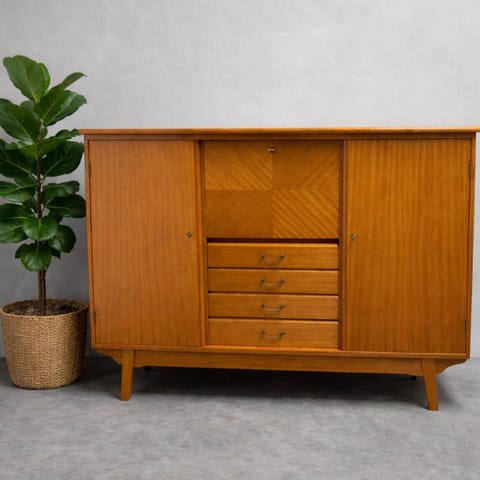 Lav bokhylle/skjenk i flott utførelse med flammebjørk/teak. Møblet er kjøpt i slutten av 1950-tallet, og er produsert av Talgø Møbler. Litt slitt, men bør enkelt kunne restaureres.