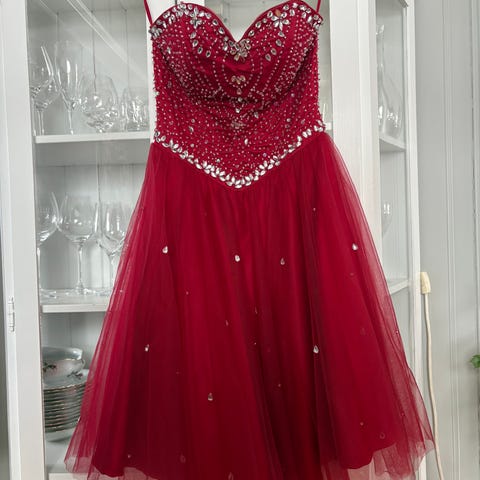 Kjole kjøpt i USA i 2012. Brukt en gang. Blitt lagret i garderobeskap i kjolepose av plast. Jeg er 169 høy og veide 50 kg på bildet. Avtagbare stropper, skjul, ekstra hemper og ekstra perler og paljetter følger med.