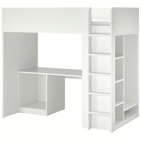 Halvhøy seng med integrert skrivebord, to skuffer og åpen hylle. Laget i hvit utførelse med grå detaljer. Passer til barnerom eller ungdomsrom, og gir kombinert sove- og arbeidsplass.
