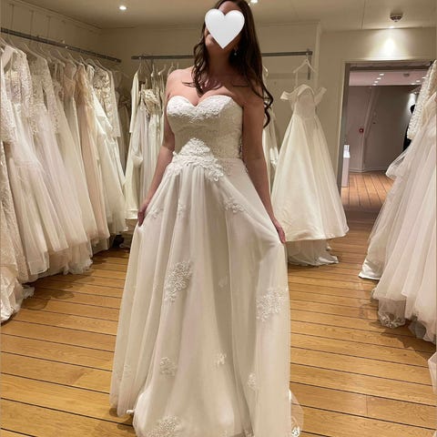 Selger min brudekjole fra Anna Sposa. Håper den kan bli brukt en gang til av noen der ute:) Kjolen er kjøpt hos By Fridman i Moss og er lagt opp til å passe meg, samt gjort et par endringer i front og bak. Jeg er en M og 165cm.