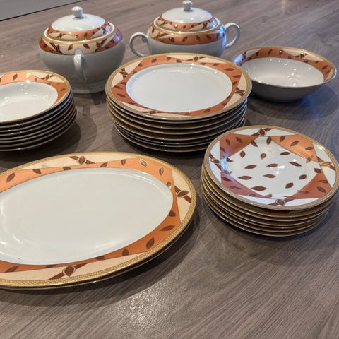 Selger et stort og komplett servise fra Homeburry. Det klassiske sitron-mønsteret ("Lemoncore") med hvite blomster og oransje detaljer gir en skikkelig sommerfølelse.