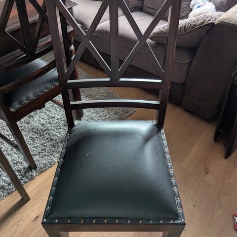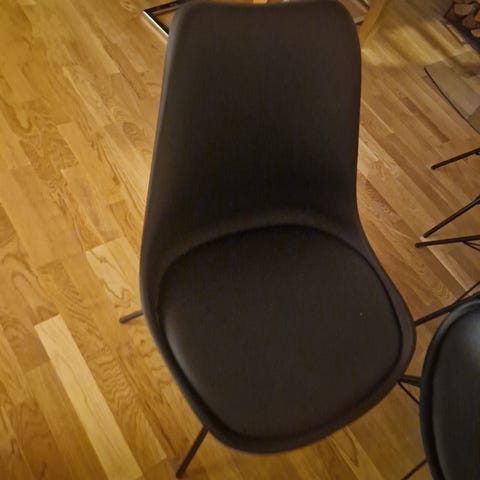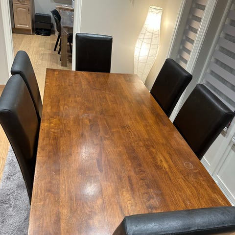 Selger spisebord med 5 skinnstoler, stolene er noe slite. Bordet er nesten som ny, ikke synlig bruksmerker.