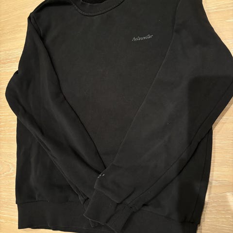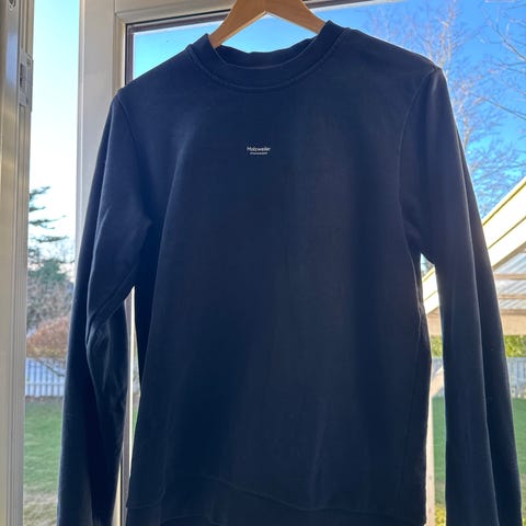 Holzweiler genser i størrelse S for herre, laget av bomull. Genseren har en beige og grønn fargekombinasjon med brede striper, og har en rund hals.