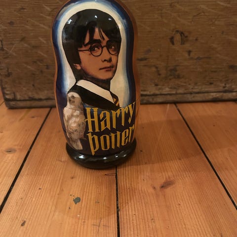 Harry Potter tematiserte tredukker (Matrjosjka) med karakterer fra serien, Dukker i ulike størrelser, malt med detaljerte ansikter og klær. To tilhørende hatter i plast, formet som trollmannshatter kommer med på kjøpet om ønskelig.