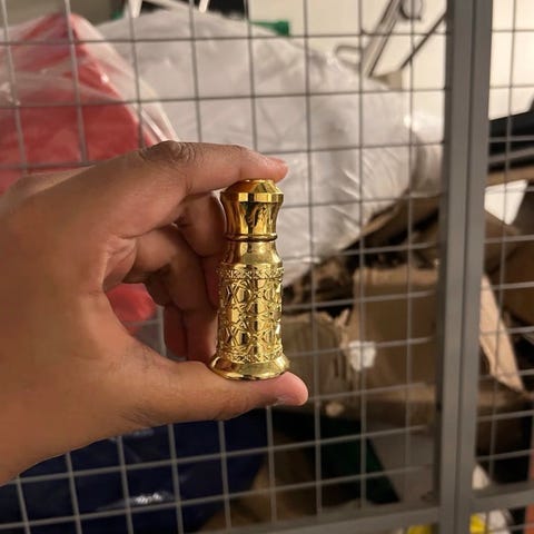 Aquabish parfymeolje i liten flaske. Produktet er pakket i en liten glassflaske med gullfarget lokk. Passer til bruk som duftolje.