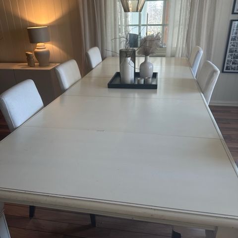 Veldig fint bord , det er synlig brukt men kan pusses / fikses eller lakkeres. Er mest rundt kantene av bordet.