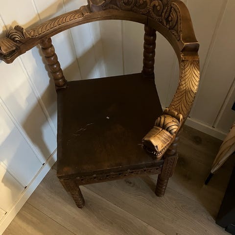 Møbelstil som minner om Thomas Chippendales design fra midten av 1700 tallet (AI). Karekteristiske buede ben som avsluttes med en utskåret klo som griper rundt en kule. Arvet fra en bygård i Kristiansand. Bredde på bord 102 cm. Lengde 115 cm. uten illeggsplater og 197 cm. med plater. 8 stoler uten armlene og 2 stoler med.