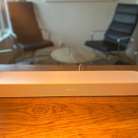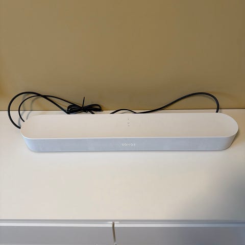 Sonos Beam lydplanke i hvit farge. Designet for å gi forbedret lydopplevelse til TV og musikk. Kompakt størrelse som passer godt i ulike rommiljøer.