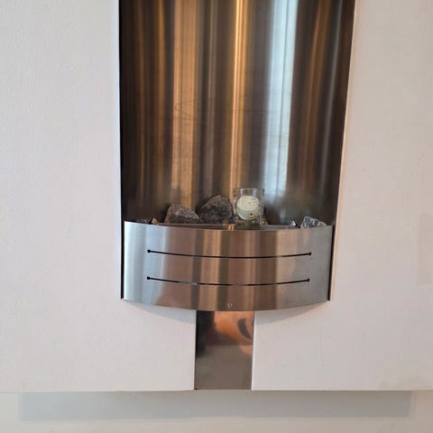 Den er ganske ny. Kjøpte den I november 2025. Følger også med en liten kontroll for å styre lys, varme, tid osv. Man kan også ta selve peisen som er i den brune «peishylle» rammen ut slik at det blir lettere å bære på, veldig lett å skru inn og ut. Peisen er ganske stor så er mulig den ser mindre ut på bilde, men den er virkelig vakker. Lurer du på noe er det bare å spørre.