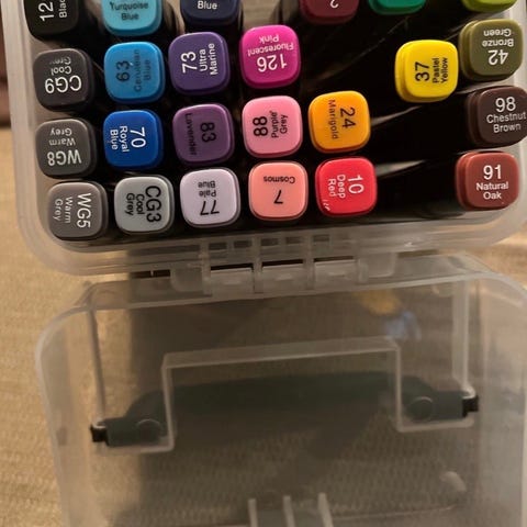 Jeg legger ved swatches (fargeprøver) av alle markørene bortsett fra de to som er nye og ikke åpnet – slik at du kan se hvordan de skriver og hvor mye blekk som ser ut til å være igjen. Selges samlet som ett sett, ikke enkeltvis, fordi jeg ikke har bruk for dem lenger. Selges billig, mest for å bli kvitt dem.