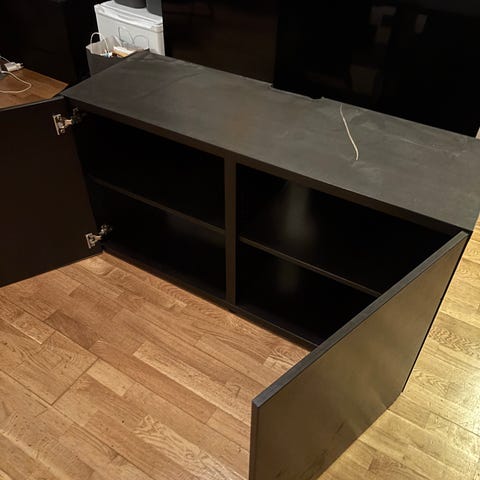 Pent brukt og anvendelig hvit TV-benk gis bort. Bredden er 150 cm, høyden er 50 cm og dybden er 42 cm