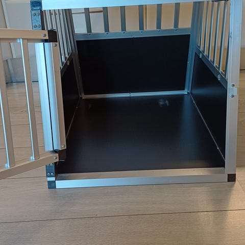 Lett og stabilt hundebur av aluminium og MDF. Skrår foran og bak for å passe i bilens bagasjerom. Med gitter som gir hunden god ventilasjon og utsikt. Enkelt å holde rent.