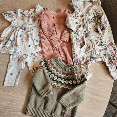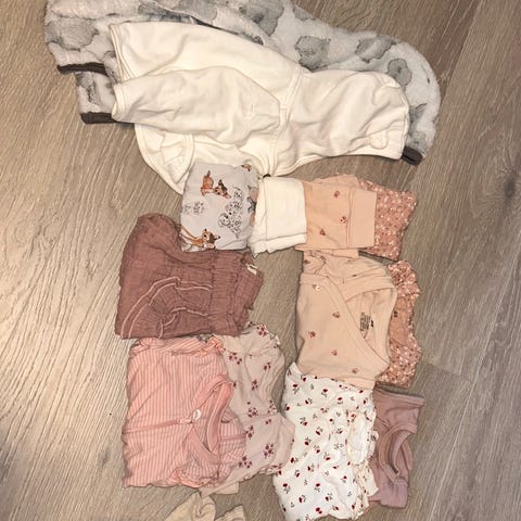 Masse fine klær i størrelse 56. Masse Newbie, litt Disney og andre merker. 7 bodyer (2 ull), 6 bukser (1 ull), 2 jakker, 7 pysjer, 1 heldress, 1 kjole.