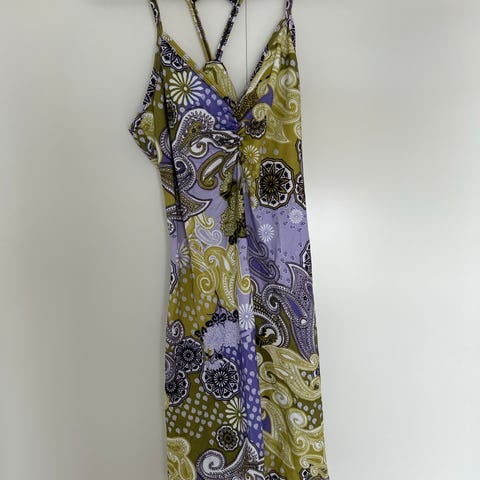 La Manera sommerkjole i størrelse M, blå farge med blomster mønster. Kjolen er designet for kvinner og har tynne skulderstropper. Pen kjole som du skal lete lenge for å finne lik.