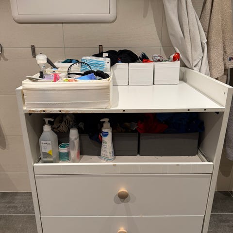 Liten IKEA kommode med tre skuffer. Hvit ramme med skuffer dekorert i blått med røde og hvite blomster. Passer til oppbevaring i barnerom eller andre rom.