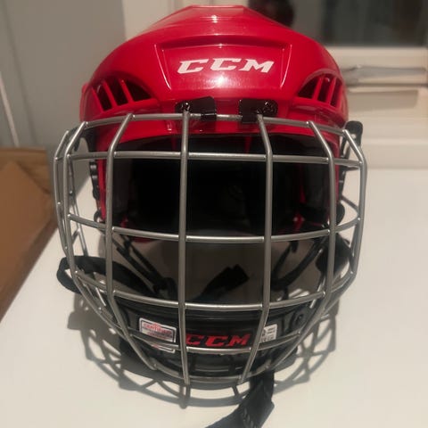 CCM HT50 ishockeyhjelm i hvit farge, størrelse M. Hjelmen er designet for ishockey og har ventilasjonshull for luftstrøm. Passer til bruk i ishockeysport.