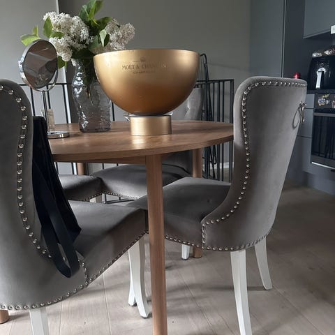 Alsted eik rundt spisebord fra Jysk og Celia grå spisestoler fra Skeidar