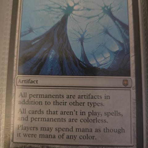 Magic: The Gathering Artifact kort med illustrasjon av en futuristisk vei og lys. Kortet har spesifikke egenskaper relatert til spillets mekanikk, inkludert at artefakter du kontrollerer er udødelige og at visse effekter ikke påvirker det. Kortet brukes i Magic: The Gathering samlekortspill.