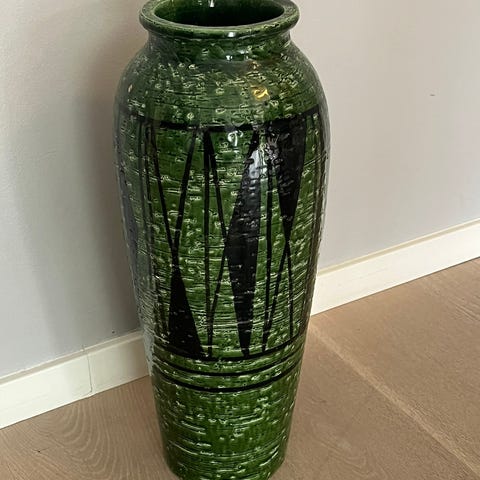 Vasen er ca. 45 cm høy. Det ene håndtaket har tidligere vært brukket og er reparert/limt, samt ett lite skår på bunn. Vennligst se bilder.
