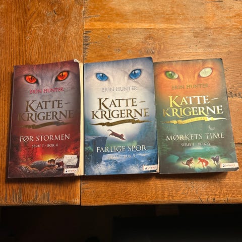 To bøker i serien "Kattegrigerne" av Erin Hunter. Serie 1, bok 5 og 6. Bøkene er på norsk og passer for lesere som er interessert i fantasygenren.
