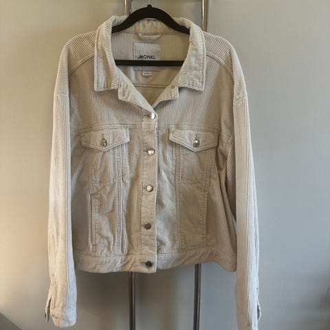 Veldig behagelig og fin, tykk fôr så den var brukt som vinterjakke og passet fint. Merke Monki og str L.