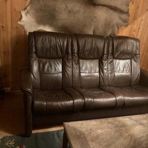 Sofa gruppe i skinn selges 500kr. En treseter og en toseter. Rygg kan vippes. Sofaene er 1,07 m høye og 80 cm dype. Den store er 1,98 m bred og den lille er 1,38 m. Seteryggene kan legges bakover så dybden kan bli 1,22 m.