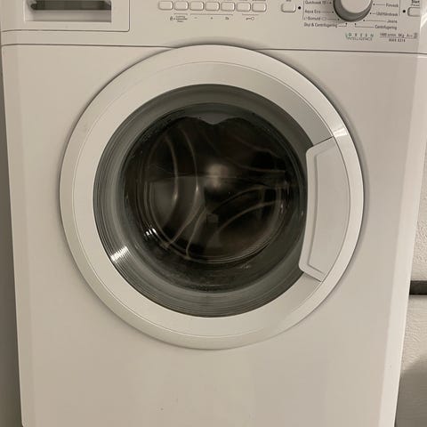 Whirlpool frontmatet vaskemaskin. Hvitt ytre med frontåpning. Utstyrt med flere vaskeprogrammer og kontrollpanel med knapper og digital skjerm. Egnet for vanlig husholdningsvask.