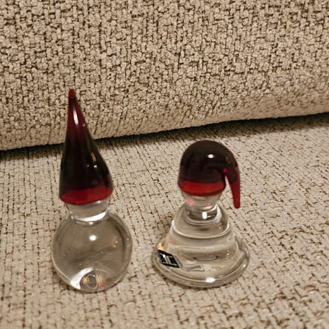 De tre vise menn i blått glass selges hbo. 350 kr. Figurene er designet av Maud Gjeruldsen Bugge. Settet består av tre figurer med ulike hodeplagg, designet for juledekorasjon. Flott sett. Gi gjerne bud.