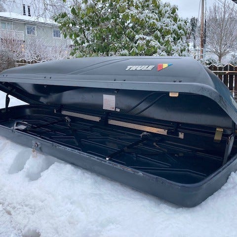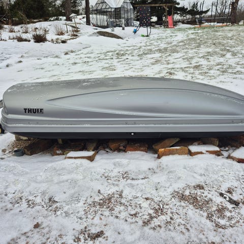 Sølvfarget Thule takboks som har stor lastekapasitet. Laget for montering på bilens takstativ. Den er utstyrt med låsesystem, og passer til transport av ski, bagasje og annet utstyr.